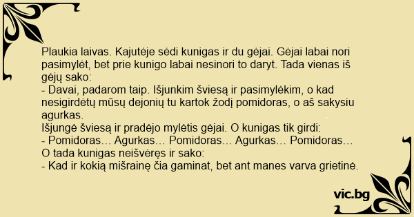 - Davai, padarom taip. Išjunkim šviesą ir pasimylėkim, o kad nesigirdėtų mūsų dejonių tu kartok žodį pomidoras, o aš sakysiu agurkas.
