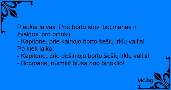 Plaukia laivas. Prie borto stovi bocmanas ir žvalgosi pro binoklį: