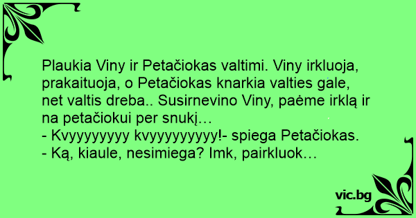 Plaukia Viny ir Petačiokas valtimi. Viny irkluoja, prakaituoja, o Petačiokas knarkia valties gale, net valtis dreba.. Susirnevino Viny, paėme irklą ir na petačiokui per snukį…