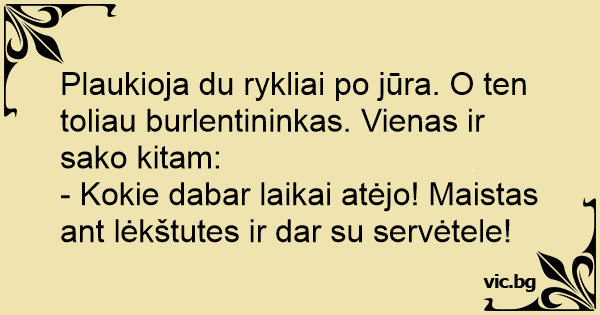 Plaukioja du rykliai po jūra. O ten toliau burlentininkas. Vienas ir sako kitam:
