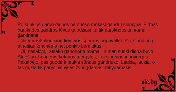 - Oi, nesakyk,- atsako gandrienė mama,- ir man sunki diena buvo. Atnešiau žmonėms keturias mergytes, irgi siaubingai pavargau.