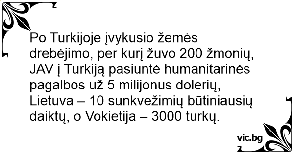 Po Turkijoje įvykusio žemės drebėjimo, per kurį žuvo 200 žmonių, JAV į Turkiją pasiuntė humanitarinės pagalbos už 5 milijonus dolerių, Lietuva – 10 sunkvežimių būtiniausių daiktų, o Vokietija – 3000 turkų.