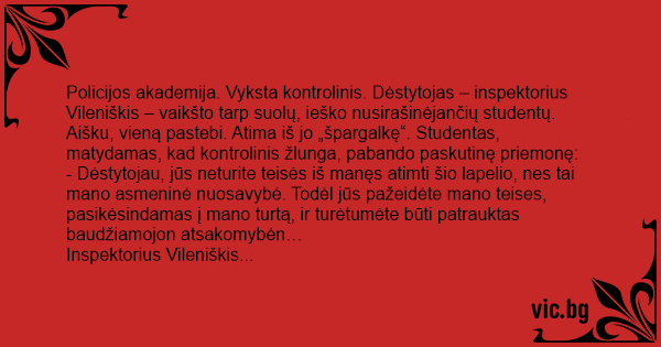 Policijos akademija. Vyksta kontrolinis. Dėstytojas – inspektorius Vileniškis – vaikšto tarp suolų, ieško nusirašinėjančių studentų. Aišku, vieną pastebi. Atima iš jo „špargalkę“. Studentas, matydamas, kad kontrolinis žlunga, pabando paskutinę priemonę: