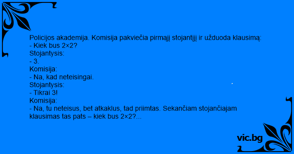 Policijos akademija. Komisija pakviečia pirmąjį stojantįjį ir užduoda klausimą: