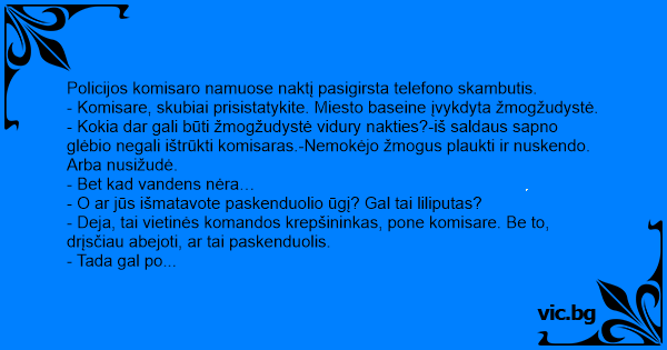 - Kokia dar gali būti žmogžudystė vidury nakties?-iš saldaus sapno glėbio negali ištrūkti komisaras.-Nemokėjo žmogus plaukti ir nuskendo. Arba nusižudė.