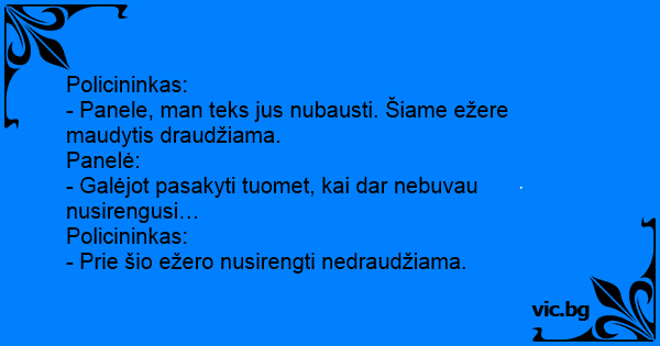 Policists meitenei: - Meitenīt, šeit nedrīkst peldēties! - Bet kāpēc jūs man to neteicāt, kad es izģērbos? - Izģērbties šeit nav aizliegts!