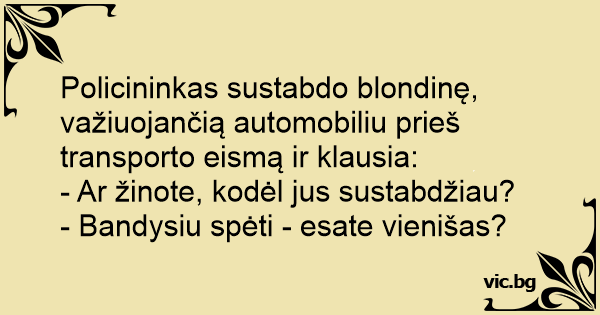 Policininkas sustabdo blondinę, važiuojančią automobiliu prieš transporto eismą ir klausia: