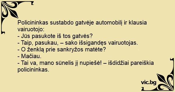 Policininkas sustabdo gatvėje automobilį ir klausia vairuotojo: