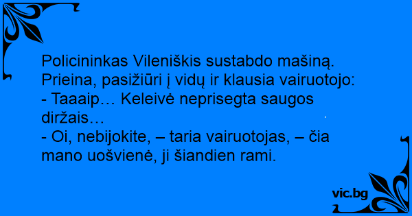 - Oi, nebijokite, – taria vairuotojas, – čia mano uošvienė, ji šiandien rami.