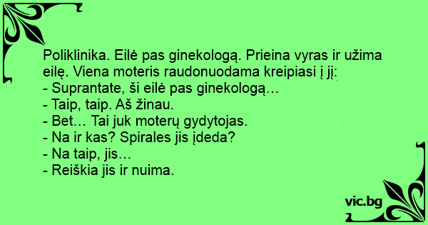 Poliklinika. Eilė pas ginekologą. Prieina vyras ir užima eilę. Viena moteris raudonuodama kreipiasi į jį: