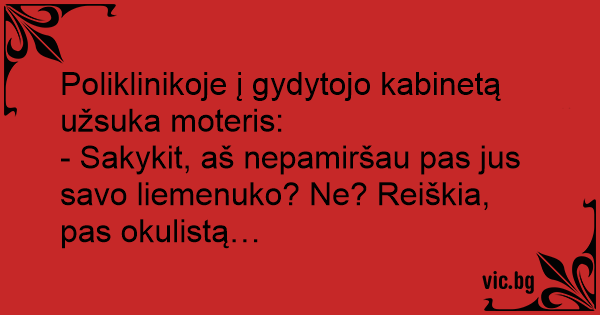 - Sakykit, aš nepamiršau pas jus savo liemenuko? Ne? Reiškia, pas okulistą…