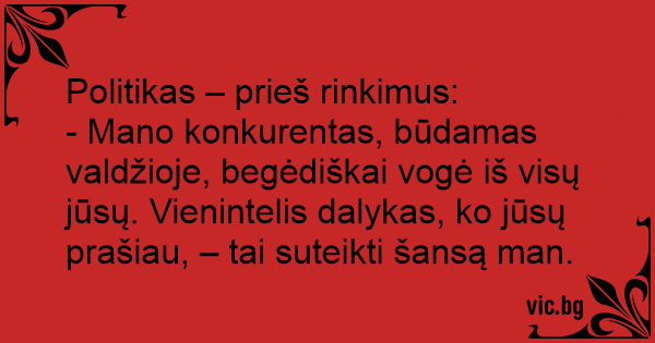 Politikas – prieš rinkimus: - Mano konkurentas, būdamas valdžioje, begėdiškai vogė iš visų jūsų. Vienintelis dalykas, ko jūsų prašiau, – tai suteikti šansą man.