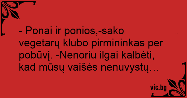 - Ponai ir ponios,-sako vegetarų klubo pirmininkas per pobūvį. -Nenoriu ilgai kalbėti, kad mūsų vaišės nenuvystų…
