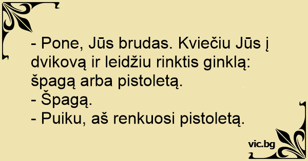 - Pone, Jūs brudas. Kviečiu Jūs į dvikovą ir leidžiu rinktis ginklą: špagą arba pistoletą.