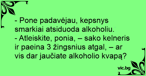 - Atleiskite, ponia, – sako kelneris ir paeina 3 žingsnius atgal, – ar vis dar jaučiate alkoholio kvapą?