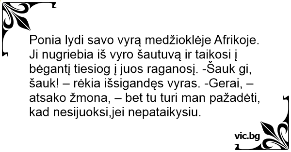 Ponia lydi savo vyrą medžioklėje Afrikoje. Ji nugriebia iš vyro šautuvą ir taikosi į bėgantį tiesiog į juos raganosį. -Šauk gi, šauk! – rėkia išsigandęs vyras. -Gerai, – atsako žmona, – bet tu turi man pažadėti, kad nesijuoksi,jei nepataikysiu.