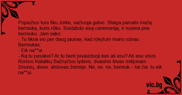 - Ką tu pasakei? Ar tu веnт įsivaizduoji kas aš esu? Aš esu visos Romos Katalikų Bažnyčios lyderis, dvasinis tėvas milijonam žmonių, dievo atstovas žemėje. Ne, ne. ne, berniuk – tai čia tu eik na**ui.