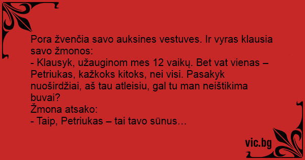 - Klausyk, užauginom mes 12 vaikų. Bet vat vienas – Petriukas, kažkoks kitoks, nei visi. Pasakyk nuoširdžiai, aš tau atleisiu, gal tu man neištikima buvai?