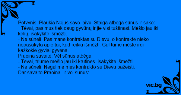 - Gerai sūneli, kad toks jau reikalas. Pas mus žinoma kontraktas, bet sąlygose parašyta, kad gyvūnus turime pristatyti gyvus į Ararato kalną ir todėl negalime leisti, kad laivas nuskęstų. Mesk visą mėšlą už borto.