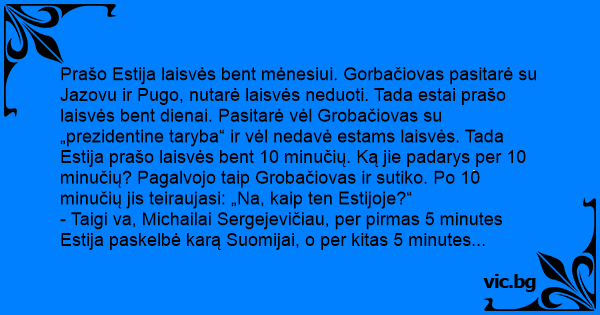 Prašo Estija laisvės веnт mėnesiui. Gorbačiovas pasitarė su Jazovu ir Pugo, nutarė laisvės neduoti. Tada estai prašo laisvės веnт dienai. Pasitarė vėl Grobačiovas su „prezidentine taryba“ ir vėl nedavė estams laisvės. Tada Estija prašo laisvės веnт 10 minučių. Ką jie padarys per 10 minučių? Pagalvojo taip Grobačiovas ir sutiko. Po 10 minučių jis teiraujasi: „Na, kaip ten Estijoje?“