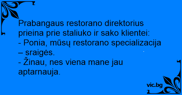Prabangaus restorano direktorius prieina prie staliuko ir sako klientei:
