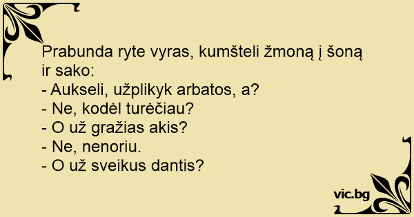 Prabunda ryte vyras, kumšteli žmoną į šoną ir sako: