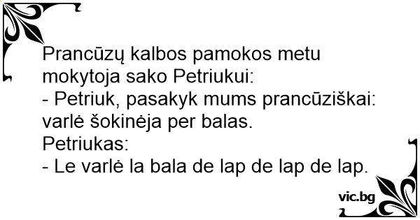 - Petriuk, pasakyk mums prancūziškai: varlė šokinėja per balas.