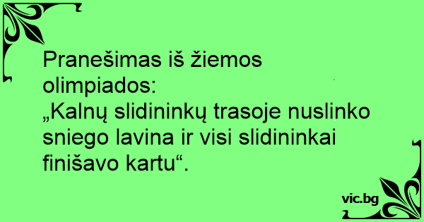 „Kalnų slidininkų trasoje nuslinko sniego lavina ir visi slidininkai finišavo kartu“.