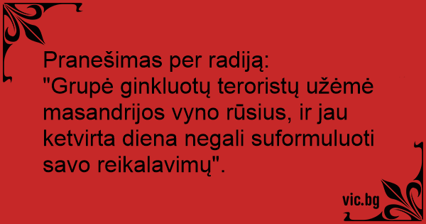 "Grupė ginkluotų teroristų užėmė masandrijos vyno rūsius, ir jau ketvirta diena negali suformuluoti savo reikalavimų".