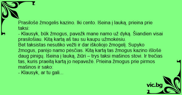 Prasilošė žmogelis kazino. Iki cento. Išeina į lauką, prieina prie taksi: - Klausyk, būk žmogus, pavežk mane namo už dyką. Šiandien visai prasilošiau. Kitą kartą aš tau su kaupu užmokėsiu. Bet taksistas nesutiko vežti ir dar iškoliojo žmogelį. Supyko žmogus, parėjo namo pėsčias. Kitą kartą tas žmogus kazino išlošė daug pinigų. Išeina į lauką, žiūri – trys taksi mašinos stovi. Ir trečias tas, kuris praeitą kartą jo nepavežė. Prieina žmogus prie pirmos mašinos ir sako: - Klausyk, ar tu gali mane už 100 dolerių namo parvežti? - Žinoma galiu!!! - O dar už 100 dolerių ar gali man atsiduoti? Taksistas kad šoko: - Eik iš čia, tu iškrypėli!!! Žmogelis priėjo prie antro taksisto. Istorija pasikartojo. Ir antrasis jį nuvijo. Tada prieina prie savo nedraugo: - Klausyk, ar tu gali mane už 100 dolerių namo pavežti? - Aišku galiu, kokios problemos! Įsėdo žmogus į mašiną ir sako: - O dabar pro tas dvi mašinas lėtaaai, lėtaaai pravažiuok…
