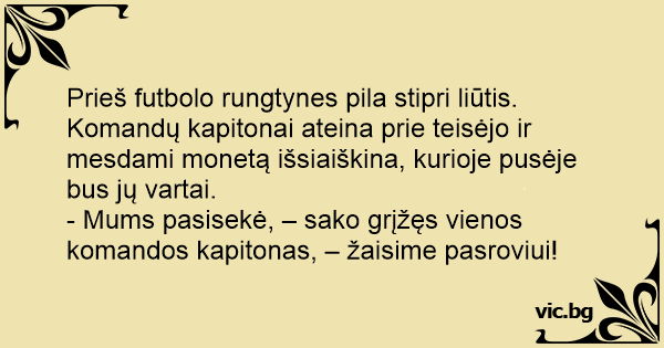 - Mums pasisekė, – sako grįžęs vienos komandos kapitonas, – žaisime pasroviui!