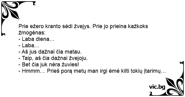Prie ežero kranto sėdi žvejys. Prie jo prieina kažkoks žmogėnas: