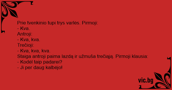 Prie tvenkinio tupi trys varlės. Pirmoji: