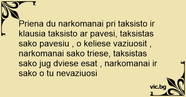 Priena du narkomanai pri taksisto ir klausia taksisto ar pavesi, taksistas sako pavesiu , o keliese vaziuosit , narkomanai sako triese, taksistas sako jug dviese esat , narkomanai ir sako o tu nevaziuosi