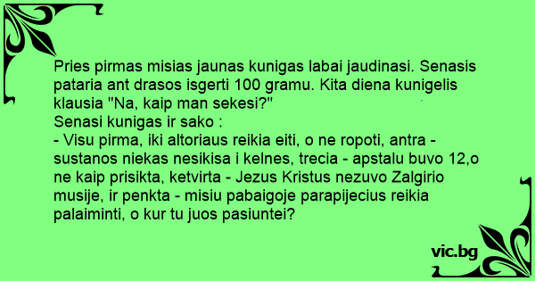 Pries pirmas misias jaunas kunigas labai jaudinasi. Senasis pataria ant drasos isgerti 100 gramu. Kita diena kunigelis klausia "Na, kaip man sekesi?"