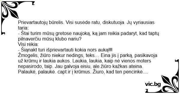 Žmogelis, žiūro niekur nedings, teks… Eina jis į parką, pasikavoja už krūmų ir laukia aukos. Laukia, laukia, kaip nė vienos moters nepasirodo, taip. Jau galvoja eisiu, ale žiūro kažkas ateina. Palaukė, palaukė. capt ir į krūmus. Žiuro, kad ten pencinkė. Pagalvojo, vis geriau nei nieko…