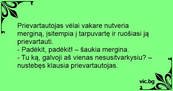 - Tu ką, galvoji aš vienas nesusitvarkysiu? – nustebęs klausia prievartautojas.