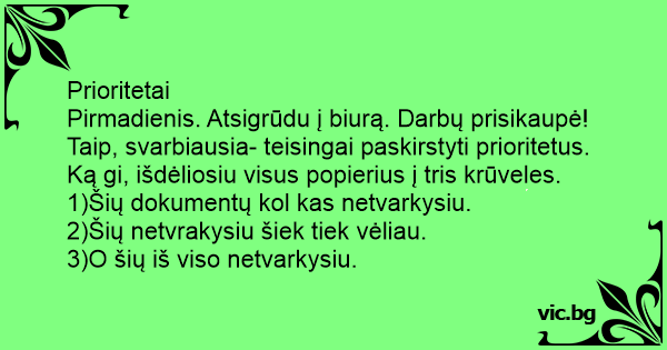 Pirmadienis. Atsigrūdu į biurą. Darbų prisikaupė! Taip, svarbiausia- teisingai paskirstyti prioritetus. Ką gi, išdėliosiu visus popierius į tris krūveles.