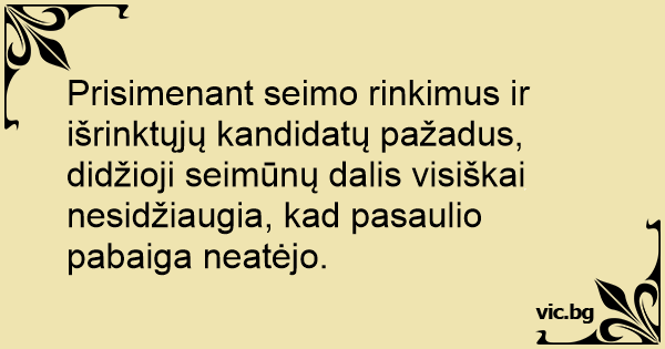 Prisimenant seimo rinkimus ir išrinktųjų kandidatų pažadus, didžioji seimūnų dalis visiškai nesidžiaugia, kad pasaulio pabaiga neatėjo.