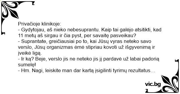 - Gydytojau, aš nieko nebesuprantu. Kaip tai galėjo atsitikti, kad 11 metų aš sirgau ir čia pyst, per savaitę pasveikau?