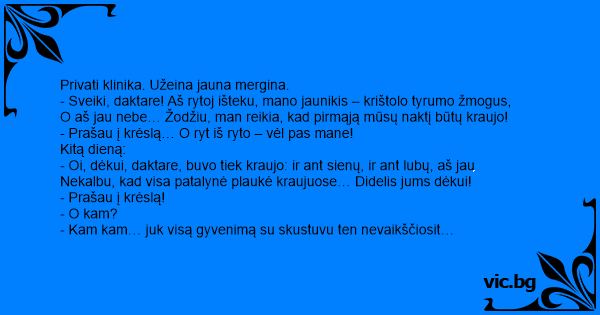- Oi, dėkui, daktare, buvo tiek kraujo: ir ant sienų, ir ant lubų, aš jau
