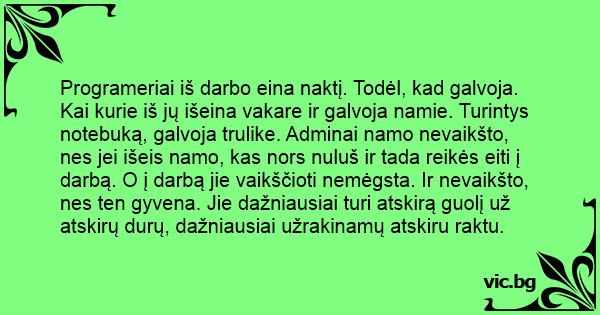 Programeriai iš darbo eina naktį. Todėl, kad galvoja. Kai kurie iš jų išeina vakare ir galvoja namie. Turintys notebuką, galvoja trulike. Adminai namo nevaikšto, nes jei išeis namo, kas nors nuluš ir tada reikės eiti į darbą. O į darbą jie vaikščioti nemėgsta. Ir nevaikšto, nes ten gyvena. Jie dažniausiai turi atskirą guolį už atskirų durų, dažniausiai užrakinamų atskiru raktu.