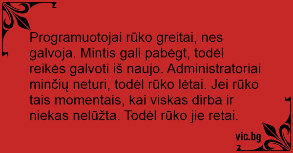 Programuotojai rūko greitai, nes galvoja. Mintis gali pabėgt, todėl reikės galvoti iš naujo. Administratoriai minčių neturi, todėl rūko lėtai. Jei rūko tais momentais, kai viskas dirba ir niekas nelūžta. Todėl rūko jie retai.