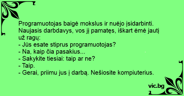 Programuotojas baigė mokslus ir nuėjo įsidarbinti. Naujasis darbdavys, vos jį pamatęs, iškart ėmė jautį už ragų: