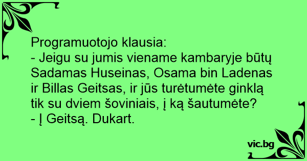 - Jeigu su jumis viename kambaryje būtų Sadamas Huseinas, Osama bin Ladenas ir Billas Geitsas, ir jūs turėtumėte ginklą tik su dviem šoviniais, į ką šautumėte?