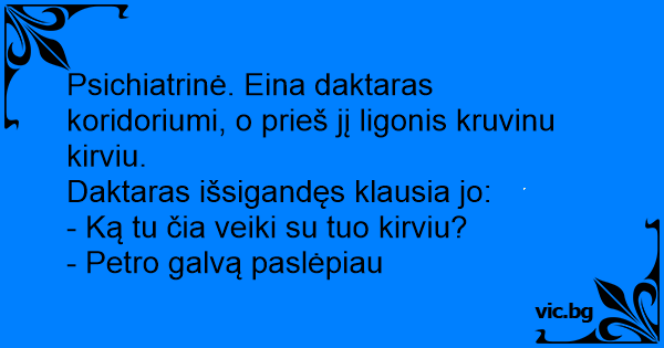 Psichiatrinė. Eina daktaras koridoriumi, o prieš jį ligonis kruvinu kirviu.