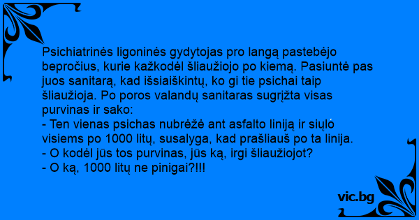 Psichiatrinės ligoninės gydytojas pro langą pastebėjo bepročius, kurie kažkodėl šliaužiojo po kiemą. Pasiuntė pas juos sanitarą, kad išsiaiškintų, ko gi tie psichai taip šliaužioja. Po poros valandų sanitaras sugrįžta visas purvinas ir sako:
