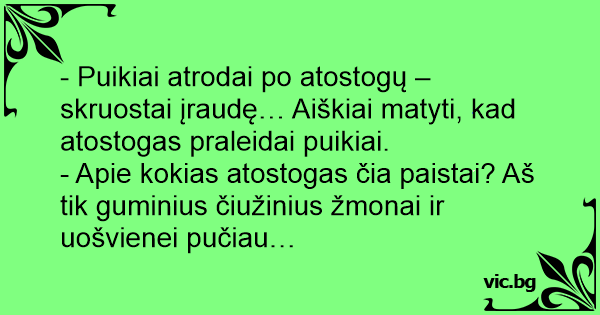 - Apie kokias atostogas čia paistai? Aš tik guminius čiužinius žmonai ir uošvienei pučiau…