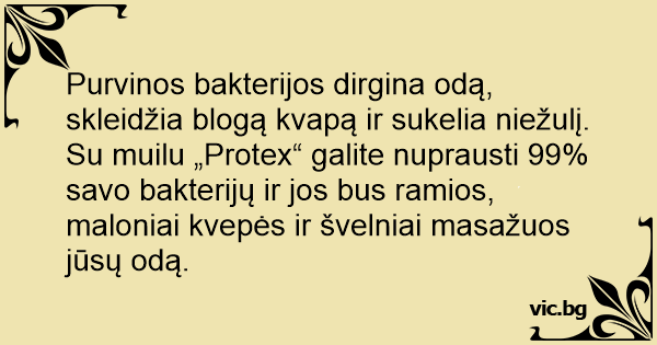 Purvinos bakterijos dirgina odą, skleidžia blogą kvapą ir sukelia niežulį. Su muilu „Protex“ galite nuprausti 99% savo bakterijų ir jos bus ramios, maloniai kvepės ir švelniai masažuos jūsų odą.