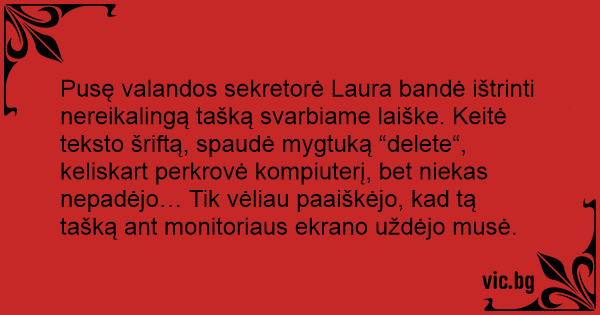 Pusę valandos sekretorė Laura bandė ištrinti nereikalingą tašką svarbiame laiške. Keitė teksto šriftą, spaudė mygtuką “delete“, keliskart perkrovė kompiuterį, bet niekas nepadėjo… Tik vėliau paaiškėjo, kad tą tašką ant monitoriaus ekrano uždėjo musė.